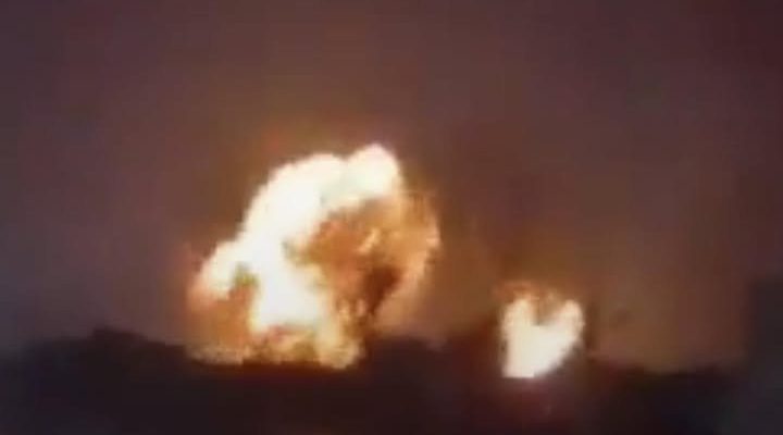 Dramatic nighttime video shows massive explosions ripping through the industrial buildings, with huge fireballs and thick smoke confirming direct hits and secondary blasts from stored munitions.