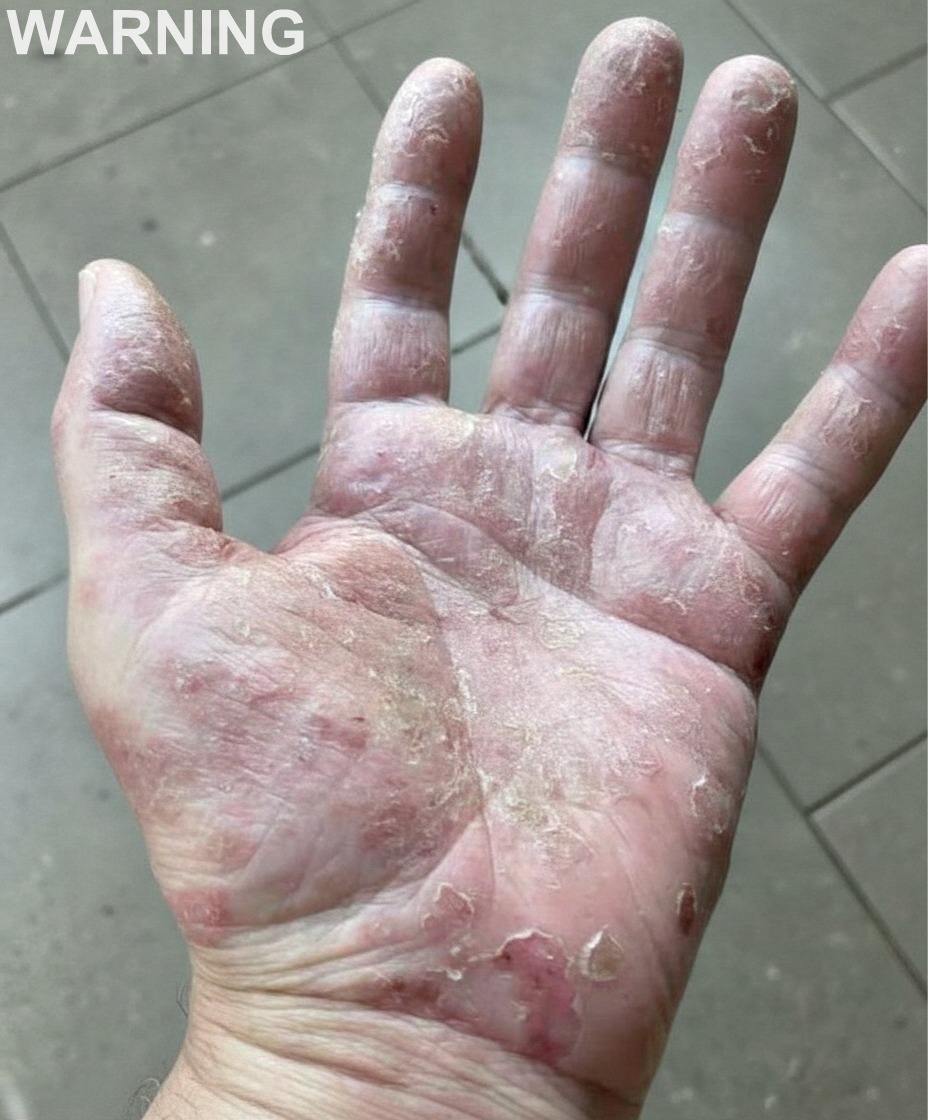 It is characterized by thickened skin, fissures, and pain, with mild itching. It mainly affects the palms.